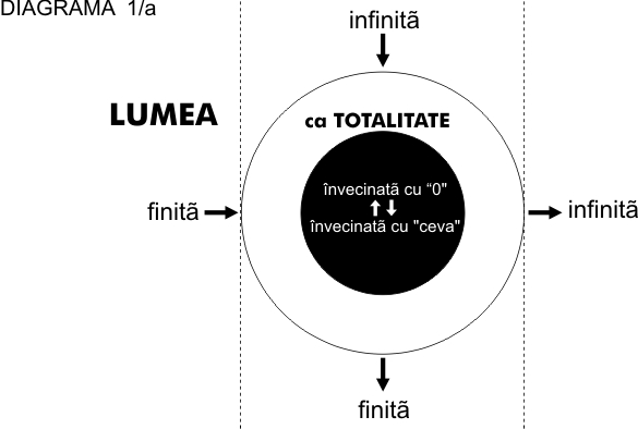 1. Pusă ca fiind absolut finită, compusă, determinată şi necesară, lumea se găseşte pusă latent într-o relaţie necesară cu propria sa infinitate ca limită interioară a sa. Identificată cu totalitatea, lumea se scindează în două părţi: interior şi exterior. Tot ceea ce era determinant pentru lume va fi proiectat în exteriorul său, ca într-o vecinătate transcendentă conţinătoare a „ceva”: propria limită. În acel loc se vor regăsi spaţiul infinit şi eternitatea, alteritatea simplă a lumii, motorul prim şi instanţa supremă de judecată. Doar această poziţie exterioară, transcendentă în raport cu lumea dată, le poate asigura condiţia lor necesară de factori determinatori şi nedeterminaţi, adică necontingenţi în raport cu lumea dată. Dar, lumea, ca totalitate a celor ce sunt, înglobează şi această exterioritate a sa, întrucât este dată odată cu ea. În consecinţă, exteriorul ei rămâne întotdeauna vid, încât limitele sale autentice (absolute) nu există. Deci, lumea dată nu este finită, compusă, determinată şi necesară; dacă lumea nu este finită, compusă, determinată şi necesară, ea nu poate fi altfel decât infinită, simplă, liberă şi haotică.